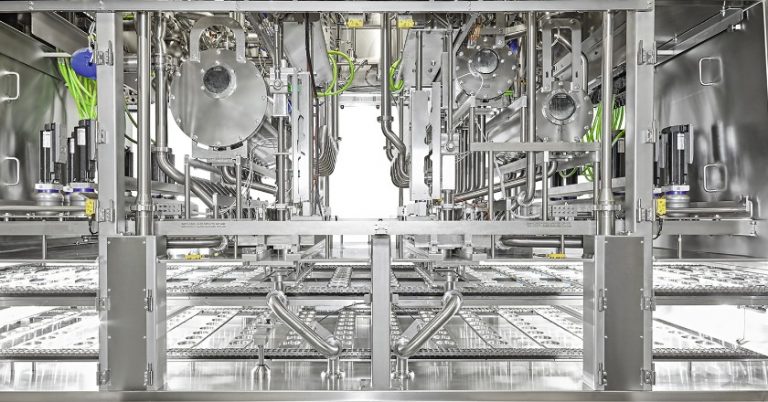 Blick auf den teileminimierten Hygienetunnel eines Grunwald-Längsläufer-Becherfüllers in Ultra-Clean(UC)-Hygiene Design...