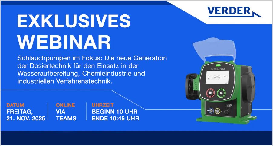 Verder Liquids veranstaltet am 21. November um 10 Uhr das Live-Webinar „Schlauchpumpen im Fokus: Die neue Generation der Dosiertechnik“. Das Webinar bietet Fachleuten aus Wasseraufbereitung, Chemie und Industrie Einblicke in die […]