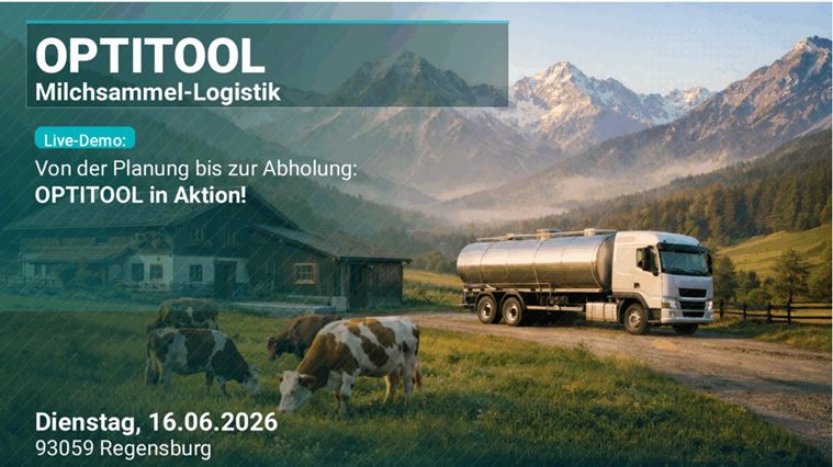 Die OPTITOOL Fachtagung Milchsammel-Logistik 2026 findet als Präsenzveranstaltung am 16.06.2026 in Regensburg statt. Dazu kommt eine online-Veranstaltung am 01.07.2026. Das Thema des Events lautet "Von der Planung bis zu Abholung: OPTITOOL in Aktion!" |