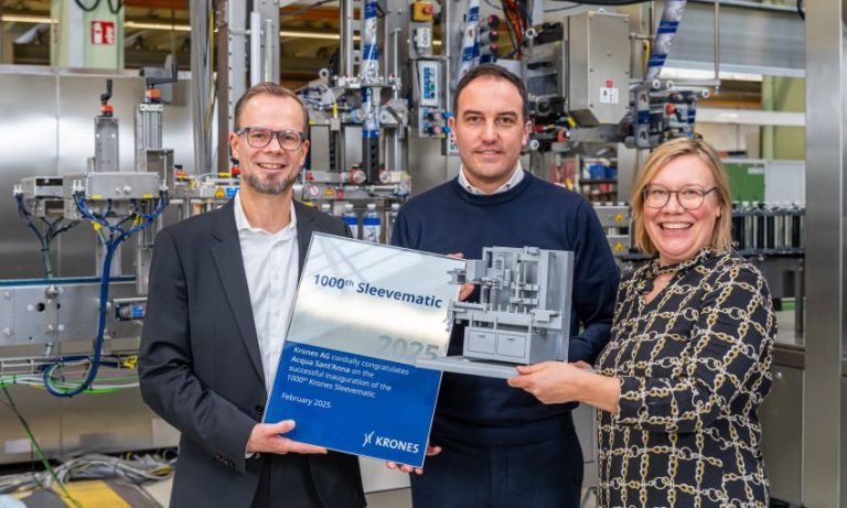 Im Bild v. l.: Heinz Hennek, Leiter des Bereichs Labelling and Decoration Technology bei Krones, Marco Balbiano, Werksleiter bei Acqua Sant’Anna, und Judith Forstner aus dem italienischen Vertriebsteam, vor der tausendsten Krones Sleevematic. Diese besondere Maschine für Acqua Sant’Anna ist zusammen mit einer Rundum-Etikettiermaschine Contiroll als Blocklösung ausgeführt. Foto: Krones
