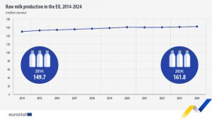 Die landwirtschaftlichen Betriebe in der EU produzierten im Jahr 2024 schätzungsweise 161,8 Millionen Tonnen Rohmilch. Dies entspricht einem Anstieg von 0,9 Millionen Tonnen gegenüber 2023 und einem Anstieg von 12,1 Millionen Tonnen gegenüber 2014 (149,7 Millionen Tonnen). Diese bestätigt das relativ stetige Wachstum der Rohmilchproduktion in der EU im Jahrzehnt bis 2024. Diese Informationen stammen aus Daten zu Milch und Milcherzeugnissen, die von Eurostat veröffentlicht wurden.