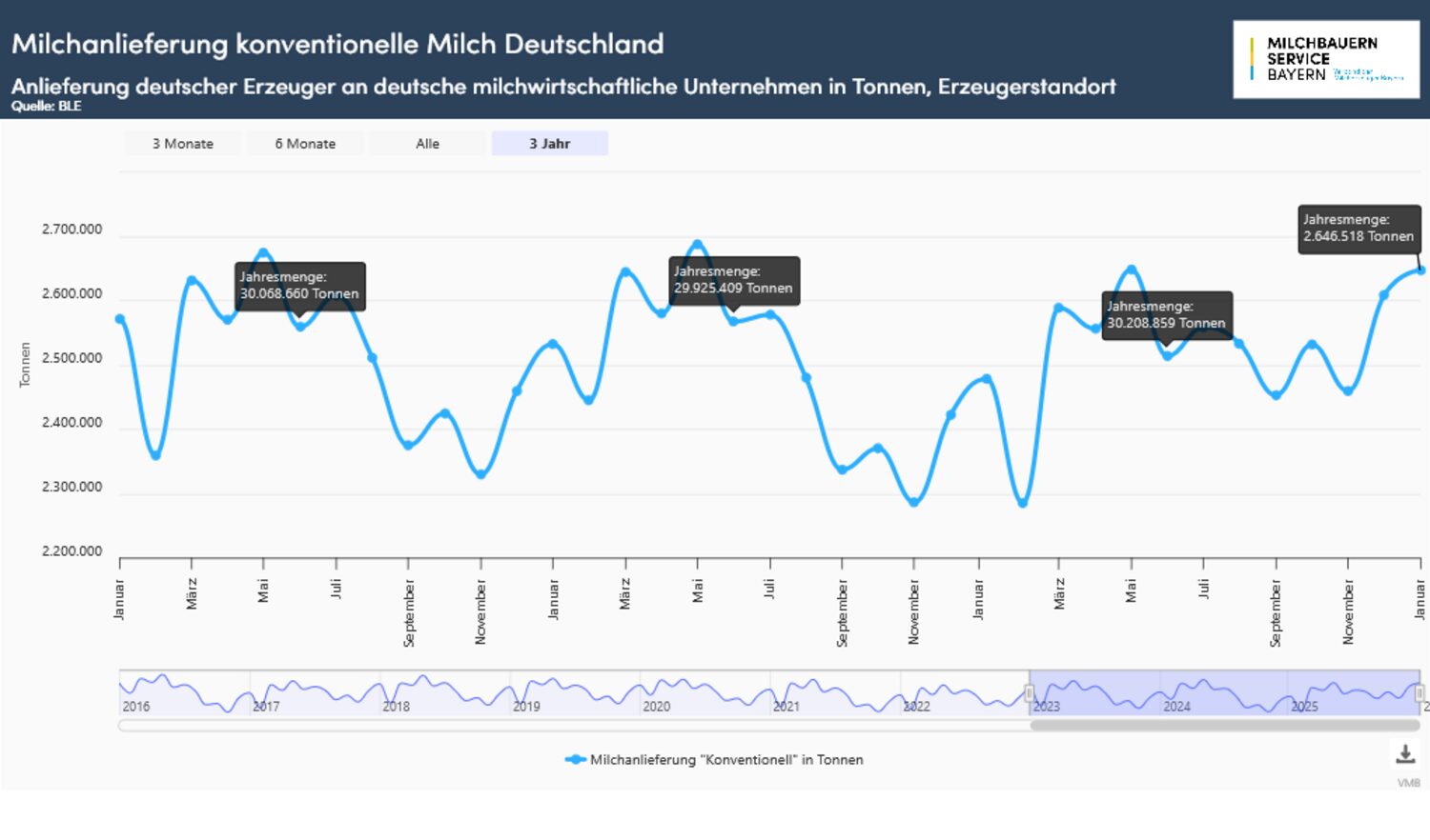 In der deutschlandweiten Milchanlieferung begann das neue Jahr wie das Jahr 2025 geendet hatte – auf spürbar höherem Niveau. Nach den aktuellen Erhebungen der Bundesanstalt für Landwirtschaft und Ernährung (BLE) wurde im Januar mit 2,85 Milliarden Kilogramm Milch (konventionelle und bio/ökologische Erzeugung) um 6,8 % mehr Milch in Deutschland erzeugt als vor einem Jahr. Auch wenn das vergangene Jahr unter den Spätfolgen der Blauzungenkrankheit ein schwächeres Erzeugungsniveau eingenommen hatte, wurde in den zurückliegenden Jahren keine annährend ähnlich hohe Milchmenge für Januar erfasst wie in diesem Jahr. Der Aufwärtstrend der im August 2025 eingesetzt hat, setzte sich somit weiter fort und zeigte sowohl in der konventionellen Milcherzeugung als auch bei Biomilch eine vergleichbare Entwicklung auf.