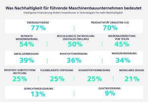 Defining Sustainability – eine neue Studie von Siemens Financial Services (SFS) – untersucht, welche Nachhaltigkeitsmerkmale die 50 weltweit führenden Maschinenbauunternehmen ihren Kunden bieten. Die Bewertung basiert auf Veröffentlichungen und Aussagen dieser „Top 50“. Die Studie verdeutlicht, was Hersteller von Maschinen heute unter der Förderung von Nachhaltigkeit verstehen. Es zeigt auch, welche Prioritäten diese Unternehmen in diesem Bereich setzen – ein Spiegelbild der Nachfrage seitens ihrer Kunden, die vornehmlich aus den Bereichen des produzierenden Gewerbes kommen. Die von den Maschinenbauern geförderten Nachhaltigkeitsmerkmale reichen von höherer Energieeffizienz, Produktivitätssteigerung durch Digitalisierung und beschleunigte Produktentwicklung mittels digitaler Zwillinge über Retrofit und Modernisierung bis hin zur Reduzierung von Abfällen, Rohstoffen, Wasserverbrauch und Schadstoffen.