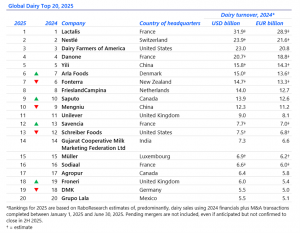 Nestlé sieht sich derweil weiterhin mit verschiedenen Herausforderungen konfrontiert und verzeichnet nach der Abspaltung von Froneri ein stagnierendes Wachstum in seinem Molkereisegment. Dairy Farmers of America (DFA) hält sich trotz schwankender Milchpreise in den USA auf dem dritten Platz. Fonterra hingegen wird aufgrund seiner Desinvestitionsstrategie in künftigen Rankings zurückfallen.