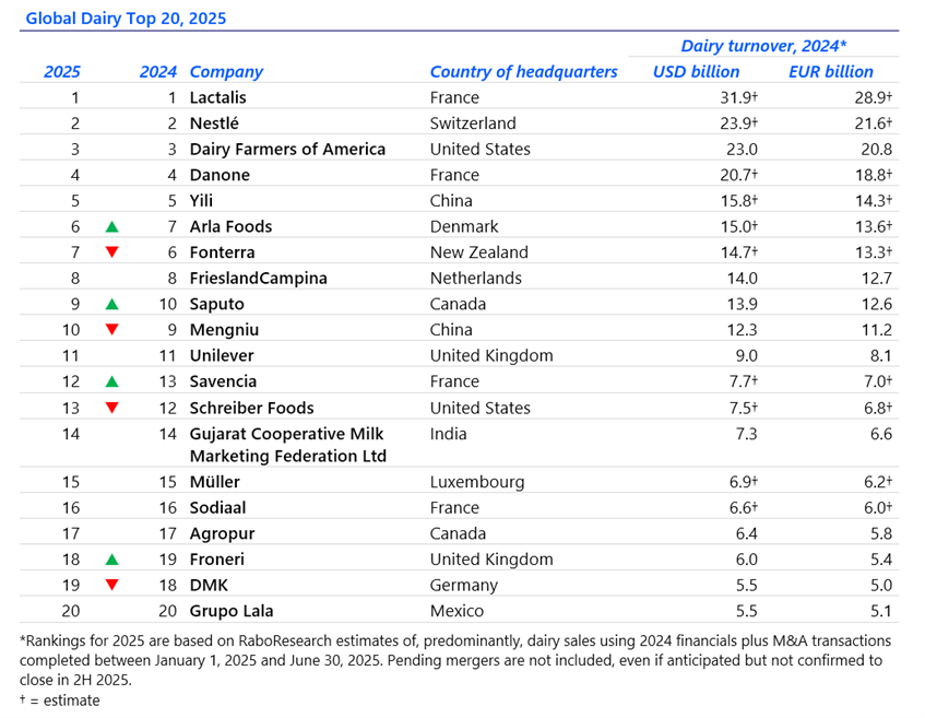 Lactalis hat seine Position als größtes globales Molkereiunternehmen gestärkt und seinen Vorsprung durch strategische Akquisitionen ausgebaut, darunter das US-Joghurtgeschäft von General Mills und das Verbrauchergeschäft von Fonterra sowie damit verbundene Geschäftsbereiche. Größere Akquisitionen sind für die Jahre 2025-2026 geplant. “Wir gehen davon aus, dass Lactalis seine Spitzenposition mit einem geschätzten Umsatz von 31,9 Mrd. USD problemlos halten wird”, sagt Tom Booijink, Senior Analyst – Dairy bei RaboResearch.