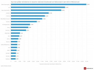 Grundlage sind Daten des Geschäftsjahres 2024 sowie eine Erhebung von April bis Juni 2025. Das Ranking der Top-20-Vertriebslinien zeigt Edeka mit 42,31 Milliarden Euro Umsatz und 5.908 Verkaufsstellen an der Spitze. Gefolgt von Discountfilialist Lidl (30 Mrd. Euro), Rewe (28,3 Mrd. €), Kaufland (21,3 Mrd. €), Aldi Süd (19,1), Netto (17,6) und Aldi Nord (14,6). Erst weit dahinter folgen beispielsweise Media-Markt, Ikea oder Obi.  Die Daten sind der aktuellen EHI-Studie „Stationärer Einzelhandel Deutschland 2025“ entnommen.