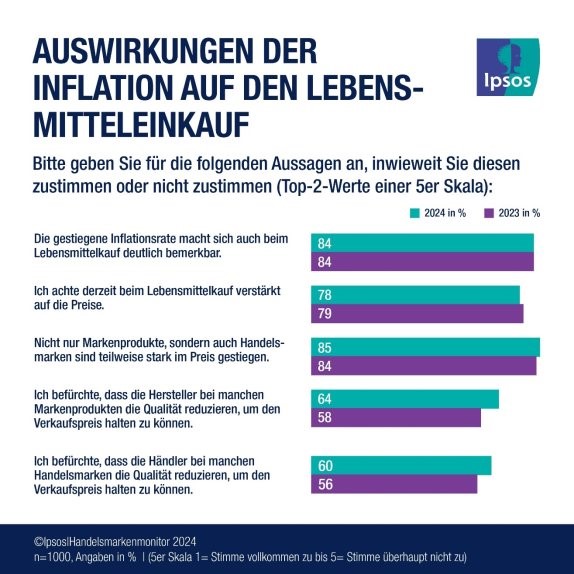 Die gestiegene Inflationsrate in Deutschland ist beim Kauf von Lebensmitteln weiterhin deutlich spürbar – das bestätigen 84 Prozent der Verbraucher laut „Handelsmarkenmonitor 2024“, den das Marktforschungsunternehmen Ipsos seit 2015 in Kooperation mit der Lebensmittel Zeitung durchführt.