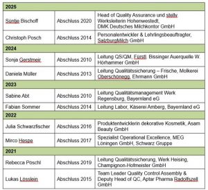 Bei einigen der Absolventen war dafür ein Arbeitgeberwechsel bzw. der Branchenwechsel notwendig. Auch in der Milchwirtschaft sind nicht wenige in andere Abteilungen, vor allem natürlich ins Qualitätsmanagement gewechselt.