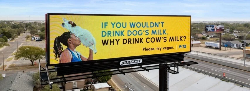 Verbraucher, die auf Expressways unterwegs sind, sehen einen neuen Aufruf von PETA, der fragt: „Wenn Sie keine Hundemilch trinken würden, warum dann Kuhmilch?“ Die Botschaft (Foto: PETA)soll daran erinnern, dass sowohl Kühe als auch Hunde Freude und Schmerz empfinden und eine Bindung zu ihren Babys aufbauen, dass aber in der Milchindustrie – auch im texanischen Panhandle, der mehr als 75 % der Milch des Bundesstaates produziert – Kühe gewaltsam geschwängert, innerhalb weniger Stunden nach der Geburt von ihren Neugeborenen getrennt und bis zu dreimal täglich an Melkmaschinen angeschlossen werden.