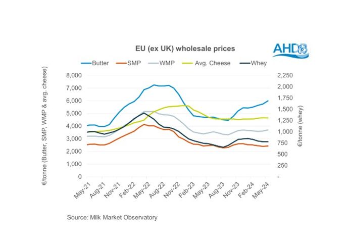 Im Mai tendierten die Großhandelspreise für Molkereiprodukte in Europa meist nach oben, mit Ausnahme von Käse, bei dem es größere Unterschiede gab. Die Milcherzeugung erreichte im Mai in vielen westeuropäischen Ländern ihren saisonalen Höchststand, und auch in den osteuropäischen Ländern wird der Höchststand in den kommenden Wochen erwartet, wobei Quellen aus der Branche darauf hindeuten, dass die Lieferungen im Jahresvergleich zwar höher ausfallen, wir uns aber auf schwache Produktionsjahre beziehen. Berichten zufolge wurden die Milchpreise in Europa gestützt, da die Verarbeiter bestrebt sind, die Lieferungen von ihren bestehenden Landwirten zu sichern und alle zusätzlich verfügbare Milch zu erwerben, vielleicht in Erwartung einer Verknappung des Angebots im weiteren Verlauf des Jahres.