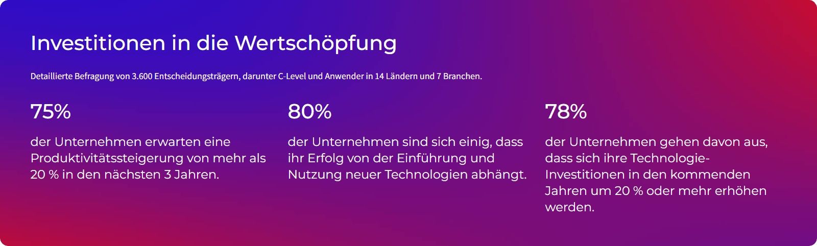 Für die Studie wurden weltweit 3.600 Entscheidungsträger, darunter C-Level und Anwender aus 14 Ländern und 7 Branchen (Automotive, Distribution, Industrielle Fertigung, Lebensmittel- und Getränkeindustrie, Gesundheitsversorgung, Mode und Hotellerie) befragt. Die Ergebnisse zeigen, dass 75 % der Unternehmen in den nächsten drei Jahren mit einer Effizienzsteigerung von 20 % rechnen. Darüber hinaus stimmen 80 % der Unternehmen der Aussage zu, dass dieser Erfolg von der Einführung neuer Technologien abhängt. Um diese Maßnahmen voranzutreiben, planen 78 % der befragten Unternehmen eine Steigerung ihrer Technologieinvestitionen um 20 % oder mehr innerhalb der nächsten drei Jahren. Maschinelles Lernen (ML) und generative KI sind die meistgenannten technischen Treiber für mehr Effizienz.