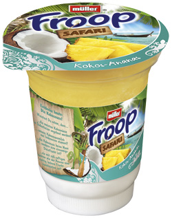 Die Molkerei Müller lanciert in der Safari-Linie des Fruchtjoghurt-Sortiments Froop...