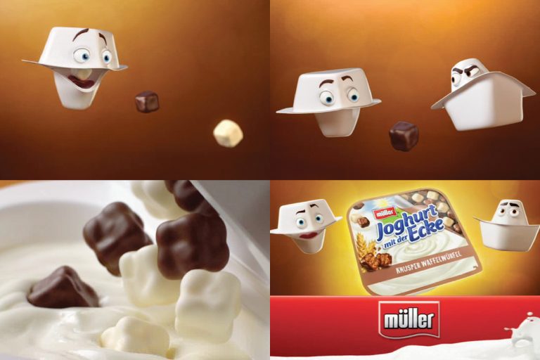 Aktueller TV-Spot Müller Joghurt mit der Ecke Waffelwürfel