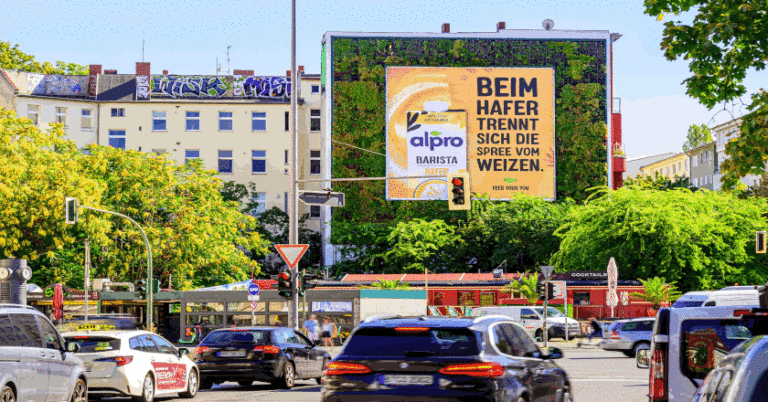 Alpro plakatiert seine aktuelle Botschaft auf Hauswand in Berlin...