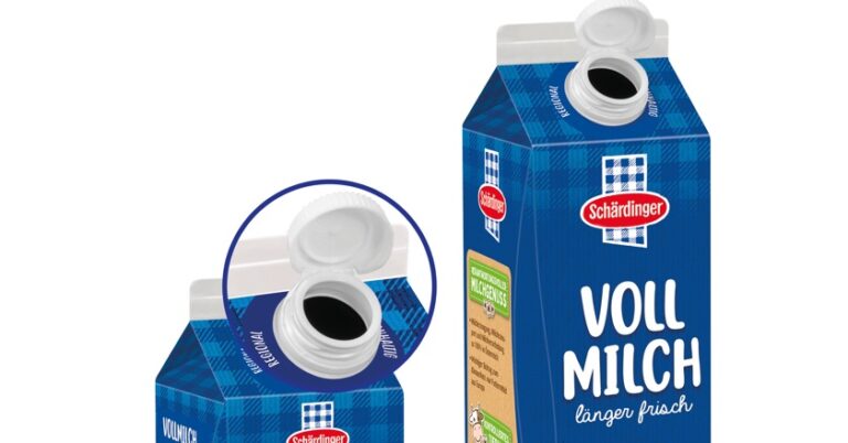 Österreichische Berglandmilch verwendet Tethered Caps für ihre Giebelpackungen...