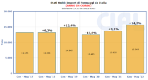 In den Vereinigten Staaten sind die Käufe italienischer Käsesorten 2021 im Trend um 14,2 % gestiegen, so dass Italien mit einem Marktanteil von 22 % den ersten Platz unter den Lieferländern einnimmt und die Importmenge von 15.500 Tonnen überschritten hat. Aus Frankreich, dem zweitgrößten Lieferanten, importierten die USA etwas mehr als die Hälfte der ital. Menge.