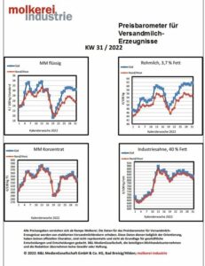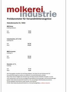 Anmerkung zu den Urheberrechten: Die Daten des Preisbarometers für Versandmilch-Erzeugnisse dürfen außerhalb der Unternehmen, die die Fachzeitschrift molkerei-industrie abonnieren, nicht verbreitet werden.