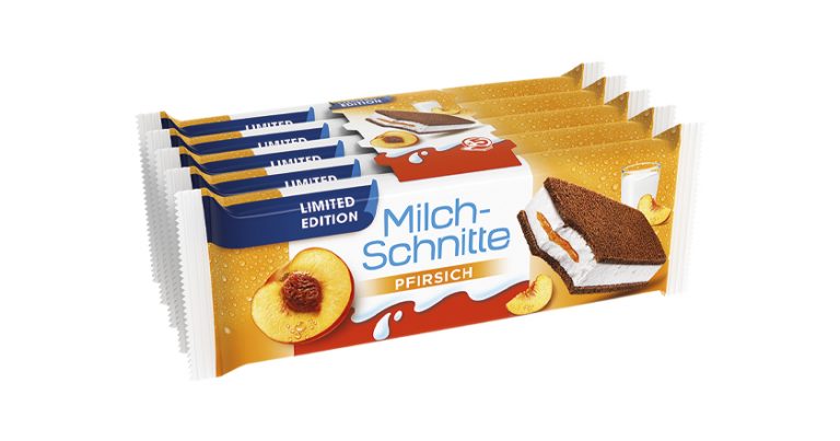 Die erste Geschmacksvariante der Milch-Schnitte ist seit Kurzem im Kühlregal: Die Milch-Schnitte Pfirsich als Limited Edition im orangen Design. Das Innere der Milch-Schnitte durchzieht eine fruchtige Creme mit Pfirsich-Geschmack. Erhältlich ist sie als 5er-Packung mit 140 Gramm (5 x 28 g).