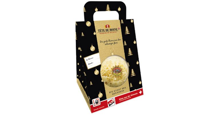 Bereits ab Oktober kann der Handel seine Kunden mit einer saisonalen Premium-Geschenkverpackung überraschen. Die im festlichen Look gestaltete Geschenktasche hat Platz für eine wiederverwendbare, transparente Kugel, die mit ca. 150 Gramm frisch gedrehten Käserosetten gefüllt ist.