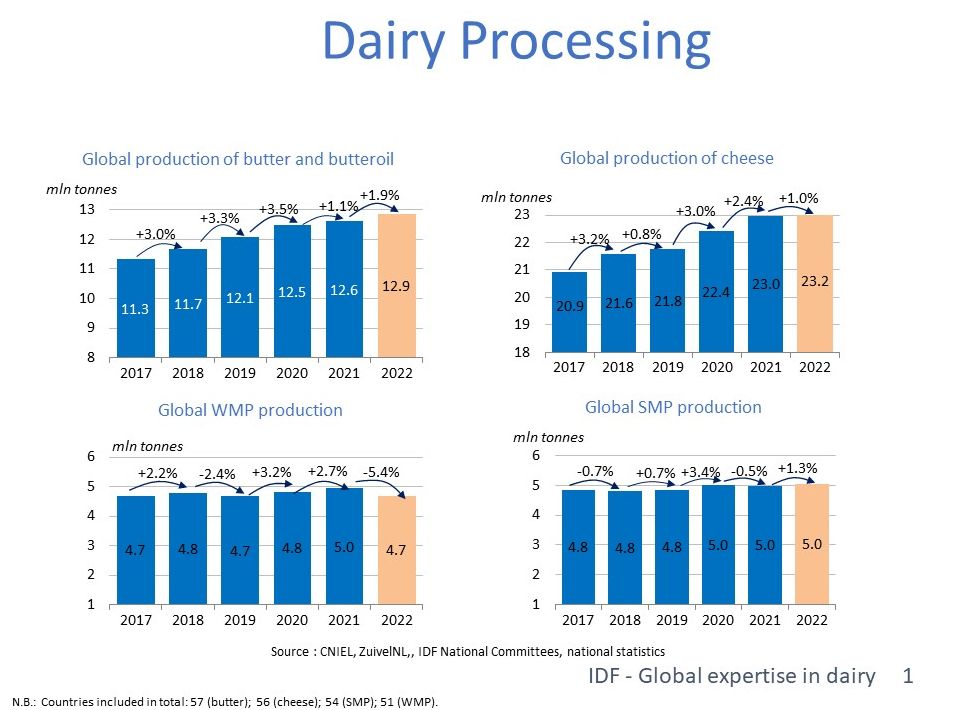 2022 war aus Sicht des Internationalen Milchwirtschaftsverbandes IDF ein außergewöhnliches Jahr. Die weltweite Milcherzeugung stieg um 1,1% auf 936 Mio. t, davon waren 758 Mio. t Kuhmilch. Damit war 2022 das zweite Jahr in Folge, in dem es ein nur unterdurchschnittliches Wachstum der Milchmengen gab. Zuwächse gab es vor allem in Milch-Mangelregionen wie Asien (+3,1%) und bei Büffelmilch (+3%).
