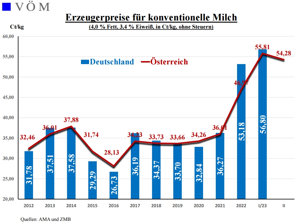 Die Erzeugerpreise konnten in Österreich sowie in der EU deutlich zulegen und erreichten zum Jahreswechsel Höchstwerte, dies vor dem Hintergrund der ebenfalls drastisch gestiegenen Kosten. Im Vergleich zu den Spotmärkten erfolgte diese Entwicklung allerdings mit Verzögerung. Der durchschnittliche Auszahlungswert konnte 2022 auf 56,72 Cent (2021 44,82 Cent) für Milch mit natürlichen Inhaltsstoffen inkl. USt. um 26,5 % zulegen. Für gentechnikfreie Milch wurden durchschnittlich 46,97 Cent/kg erzielt (2021: 36,01 Cent, für Milch mit 4,0 % Fett, 3,4 % Eiweiß, ohne USt.), im Februar 2023 54,28 Cent.