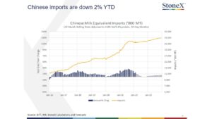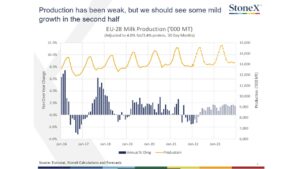 Der US-amerikanische Finanzdienstleister StoneX hat soeben in einer online-Veranstaltung einen Global Dairy Market Outlook gegeben. Während sich die Milchpreise in der EU zu immer neuen Rekorden bewegen, sinken sie in Ozeanien aufgrund einer schwächeren Exportnachfrage. In den USA ist die Milcherzeugung um 1% rückläufig, Logistikprobleme hindern die Milchindustrie daran, von den hohen Preisen im Weltmarkt ausreichend zu profitieren.