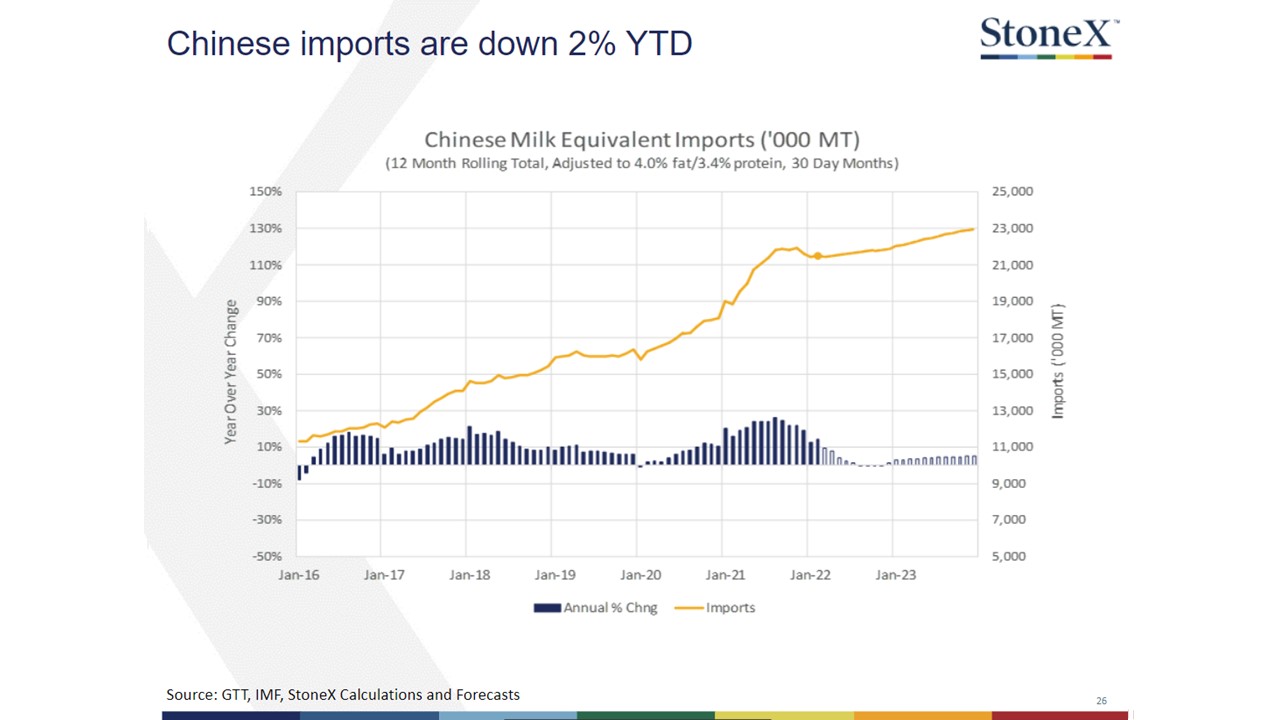 China sitzt auf relativ hohen Beständen, außerdem erschwert die Nullcovid-Politik der Regierung dort den Absatz ebenso wie den Import (Lockdowns, Sperrung von Häfen). Aus Sicht von StoneX wird China dieses Jahr ein schwieriger Markt bleiben, aktuell liegen die Importe um 2% unter dem Vorjahr.