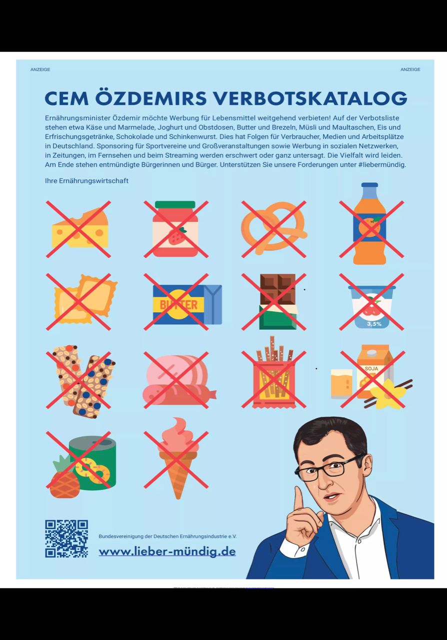 Das von  Bundesagrarminister Cem Özdemir geplante Werbeverbot für bestimmte Lebensmittel hätte weitreichende Folgen. Die Bundesvereinigung der Deutschen Ernährungsindustrie hat hiergegen die Initiative www.lieber-muendig.de gestartet.