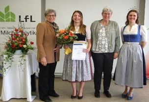 Die beste MiLa – Anna Grundler (Meggle, Wasserburg) mit Schulleiterin Petra Hartner, Laudatorin Dr. Almut Schöne-Pfann (LVFZ) und der bayerischen Milchprinzessin