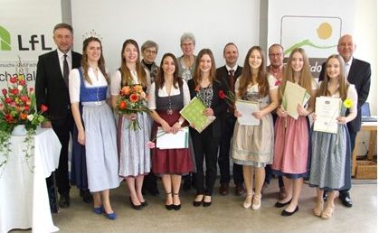 Die Besten der Besten mit Laudatoren – die bayerische Milchprinzessin Philomena Mögele, die Prüfungsbes-te Anna Grundler, Michelle Pögl, Vera-Hedwig Zimmermann, Simone Kick, Eva Maria Vordermayer, Elisa-beth Bachmaier (vorne v.l.n.r.) und der 1. Vorsitzende des MVF Günther Felßner, Petra Hartner, Dr. Almut Schöne-Pfann, Simon Gutensohn, Roland Jank sowie Helmut Leidenberger (hinten v.l.n.r.)