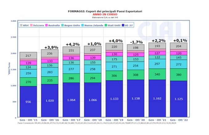 Ein möglicher Absatzmarkt für das europäische Angebot ist jedoch die weltweite Nachfrage nach Käse, die weiterhin stark ist. Insgesamt blieben die weltweiten Käseausfuhren zwischen Januar und Oktober im Vergleich zum Vorjahr stabil (+0,1 %). Die 37 000 Tonnen weniger, die die EU exportierte, wurden durch den Anstieg der US-Ausfuhren (+40 000 Tonnen) mehr als ausgeglichen.