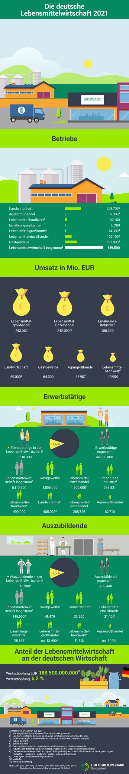 Insgesamt gehören rund 619.500 Betriebe zur Lebensmittelwirtschaft. Die meisten von ihnen (258.700 Betrieben) sind für die pflanzlichen und tierischen Rohstoffe zuständig, zählen also zur Landwirtschaft. Danach folgen das Gastgewerbe (197.800 Betriebe) und der Lebensmitteleinzelhandel (105.100 Betriebe). Den größten Umsatz erzielte der Lebensmittelgroßhandel (253 Milliarden Euro), dahinter kommt gleich der Lebensmitteleinzelhandel (242 Milliarden Euro) und mit weitaus größerem Abstand die Ernährungsindustrie (186 Milliarden Euro).