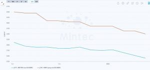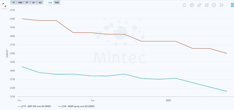 Zum Vergleich: Der MBP für Magermilchpulver EXW Europa [Mintec Code: J117] wurde am 26. Januar mit 2.400 €/mt bewertet, 125 €/mt in der Woche. Der MBP für Vollmilchpulver-Spray EXW Europa [Mintec Code: J118] wurde zuletzt am 26. Januar mit 3.500 €/mt bewertet, was einem Rückgang von 4 % gegenüber der Vorwoche entspricht.