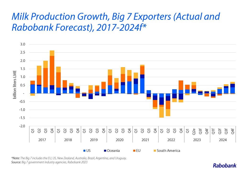 Die Rabobank senkt ihre Prognose für die Milchproduktion im Jahr 2023. Es wird erwartet, dass die Milcherzeugung in den sieben großen Exportregionen im Jahr 2023 um 0,3 % gegenüber dem Vorjahr wachsen wird. Die Herabstufung gegenüber der Schätzung des letzten Quartals von 0,5 % ist auf Rückgänge in den meisten globalen Schlüsselregionen zurückzuführen, darunter die USA, die EU und Neuseeland. Bis 2024 wird ein Produktionsanstieg von 0,4 % erwartet, was weit unter dem durchschnittlichen jährlichen Anstieg von 1,6 % zwischen 2010 und 2020 liegt.