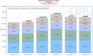 Italien, der führende Exporteur von Käse in die Schweiz, konnte diese Gelegenheit in den Segmenten Frischkäse (+2,6 % in der Menge) und geriebener oder pulverisierter Käse (+2,2 %) nutzen, indem es sich die Vorliebe der Schweizer für den Käsekonsum zunutze machte (22,9 kg pro Kopf im Jahr 2022 gegenüber einem EU-Durchschnitt von 20,96 kg).