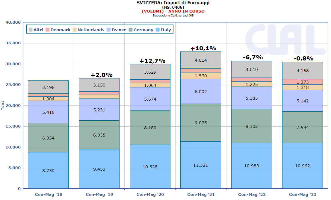 Die Einfuhren von Milcherzeugnissen sind in den ersten fünf Monaten des Jahres 2023 insgesamt gestiegen: mengenmäßig um +2,6 % und wertmäßig um +15,6 %.