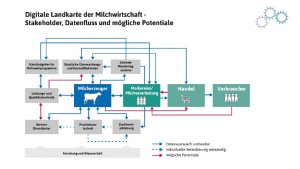 Die „Digitale Landkarte der Milchwirtschaft“ (siehe Graphik) zeigt die Vielzahl der Akteure, Themen und Zielgruppen und macht deutlich, dass heute bereits zahlreiche Ansätze zur digitalen Informationserfassung vorhanden sind, beispielsweise in vorhandenen Ansätzen der Zucht, Tiergesundheit, Milchqualität und Feldwirtschaft. Ein gemeinsamer Ansatz würde Zeit und Kosten sparen und einen strategisch-technologischen Nutzen für alle Beteiligten bieten. Deshalb begrüßen wir einen konstruktiven Austausch mit Politik, Wissenschaft, Wirtschaft und relevanten Stakeholdern.