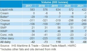 Die Handelsbilanz des Vereinigten Königreichs für Milcherzeugnisse war 2021 mengenmäßig negativ, nachdem zwei Jahre lang ein kleiner Überschuss zu verzeichnen war. Einschließlich der Verbringung von unverarbeiteter Milch ergab sich im Jahr 2021 ein Defizit von 68.000 Tonnen, gegenüber einem Überschuss von 53.000 Tonnen im Jahr 2020. Die anhaltende Pandemie hat auch im Jahr 2021 die inländischen und internationalen Märkte gestört. Darüber hinaus brachte der Austritt aus der EU Anfang 2021 neue Ausfuhrbestimmungen mit sich, die weitere Störungen verursachten.