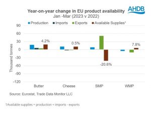 Die Verfügbarkeit von Milcherzeugnissen in der EU war im ersten Quartal 2023 im Vergleich zum gleichen Zeitraum 2022 uneinheitlich. Das Angebot an Butter, Käse und VMP stieg, während das Angebot an MMP zurückging. Die Milcherzeugung in der EU blieb im ersten Quartal 2023 mit 34,42 Mrd. Litern gegenüber dem Vorjahr nahezu unverändert (Anstieg um 0,08 %). Schwache Nachfrage auf den Binnen- und Weltmärkten aufgrund des Inflationsdrucks prägten den Marktverlauf.